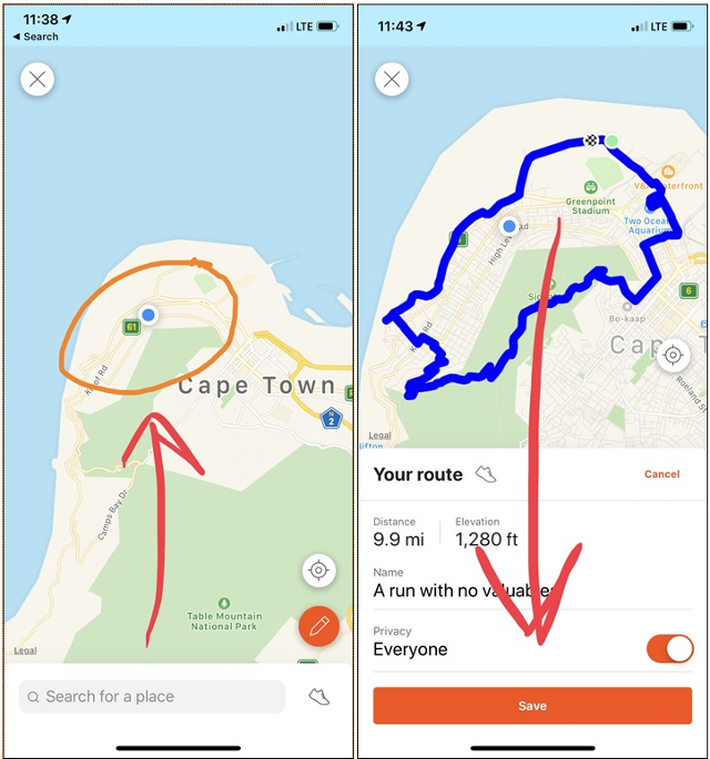 좌측과 같이 화면상에 손가락으로 대충 동그라미를 그리면 스트라바가 인기가 많은 길들을 위주로 우측과 같이 세밀한 코스를 짜줍니다. 저장하고 나서 가민 기기의 Strava Routes 앱을 켜서 코스를 골라주면 기기로 바로 올라가고 라이딩이 가능합니다.