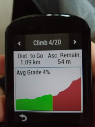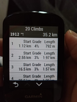 530/830의 제일 좋은 기능 중 하나는 ClimbPro 기능입니다. GPX 코스상에 오르막으로 보이는 곳이 있으면 따로 모아서 Climb 페이지를 구성해줍니다. 목록을 보면 오르막이 몇개인지, 각각의 오르막들까지의 거리, 경사도, 오르막의 길이 등등을 일목요연하게 보여줍니다.