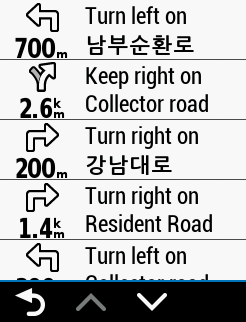 가민의 한글 폰트가 안이쁘고 눈에 잘 안들어와서 평소에 기기를 영문으로 설정을 해놓고 쓰는데요, 와츠맵은 그런 때에도 한글로 지명을 잘 보여주는데, HERE맵은 영문으로 바꿔서 보여줍니다. 근데, 글자가 많아서 길이 잘 안보이는 경우가 많습니다. 1000에서 OSM 지도 쓸때같은 느낌이랄지.. 지도는 그냥 한글로 나왔으면 좋겠습니다.