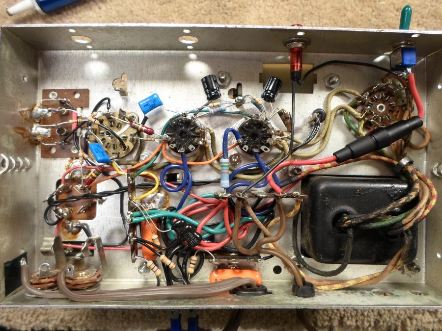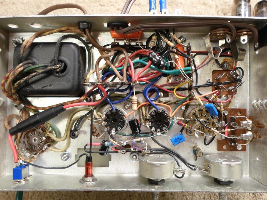 (그림 1) 앰프의 아랫면. 바이어스 조절 기능이 추가됨. B+전압강하 저항이 820R로 바뀜. 그 외에는 큰 변화 없으나, 자세히 보면 앰프 윗면 후방의 파일럿 램프 슬롯은 바이어스 테스팅 포인트로 배선한 것을 알 수 있다.