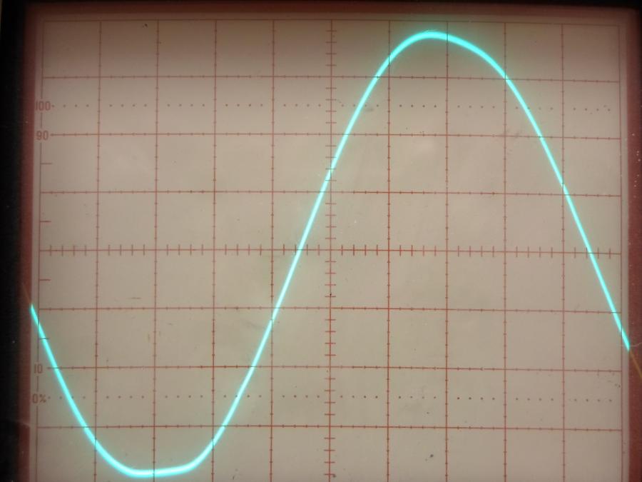 (그림 2) 4와트 출력. 클리핑이 시작되지만 상하 대칭형인 것을 알 수 있다. 기존의 잘못된 높은 바이어스 설정에 의한 비대칭 클리핑의 문제가 해결되었음을 알 수 있다.